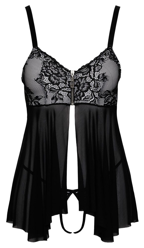 Stylisch und sexy! Kurzes, ausgestelltes Babydoll und String ouvert im Set von Cottelli LINGERIE. Babydoll aus weichem elastischen Powernet. Vorne komplett offen, mit durchgehendem Reißverschluss zwischen den mit feiner schwarzer Spitze überzogenen weißen Cups. Die Träger sind passend verstellbar. Der elastische Riemchen-String verführt mit seinem offenem Schritt. 90% Polyester, 10% Elasthan Spitze 90% Polyamid, 10% Elasthan.