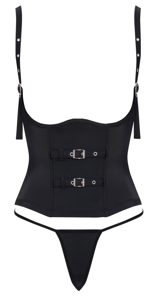 Für Kurven, die alle Blicke anziehen! Schwarze Taillen-Corsage von Cottelli PARTY mit seitlichen verstellbaren Schnallenträgern. Mit Cup-Bügeln zur leichten Unterstützung der freiliegenden Brüste. Vorne mit zwei eingearbeiteten Formstäben und 2 dekorativen, verstellbaren Schnallenriemchen. Im Rücken mit Hakenverschluss. Solo getragen ein sinnlicher Eyecatcher. Mit Shirt oder Bluse darunter getragen, eine stilvolle Corsage für kurvenbetonende Styles. Rundum weich und elastisch anschmiegsam für maximalen Tragekomfort. Der dazu passende Mini-String ist inklusive! 80% Polyamid, 20% Elasthan.